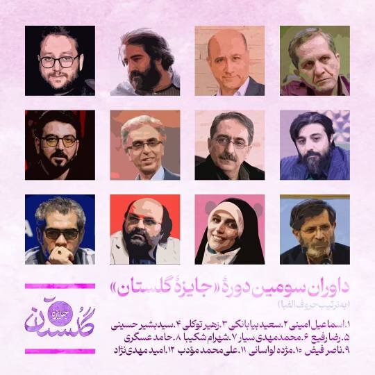 ۱. اسماعیلی امینی ۲. سعید بیابانکی ۳. زهیر توکلی ۴. سیدبشیر حسینی ۵. رضا رفیع ۶. محمدمهدی سیار ۷. شهرام شکیبا ۸. حامد عسگری ۹. ناصر فیض ۱۰. مژده لواسانی ۱۱. علیمحمد مؤدب ۱۲. امید مهدینژاد.